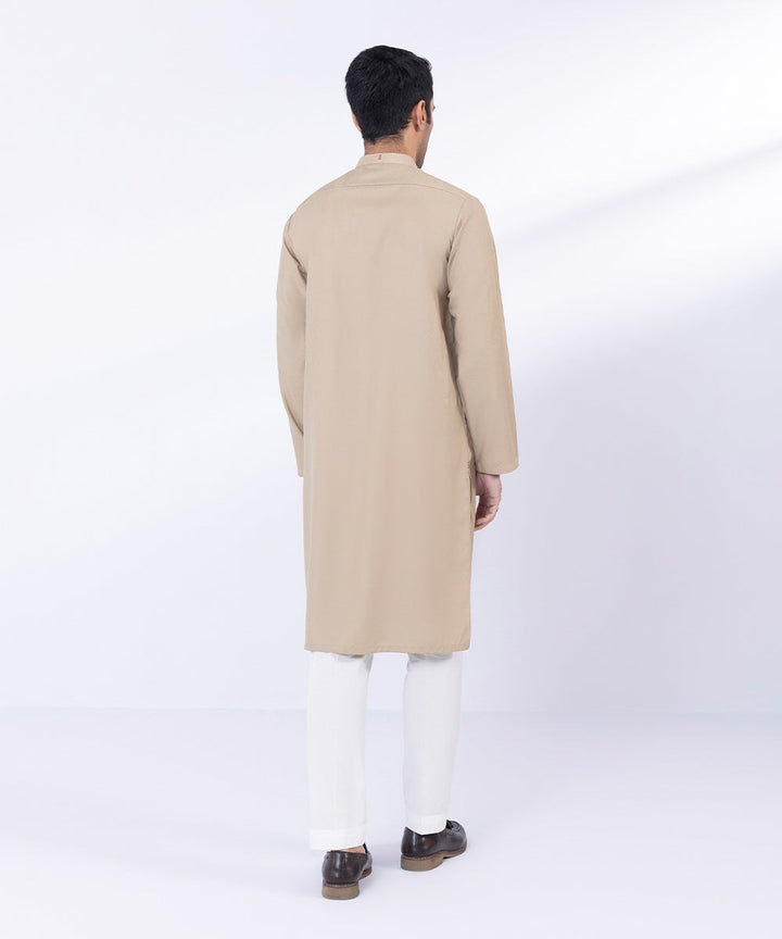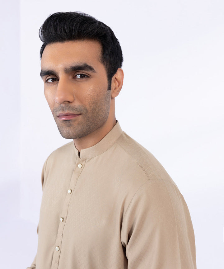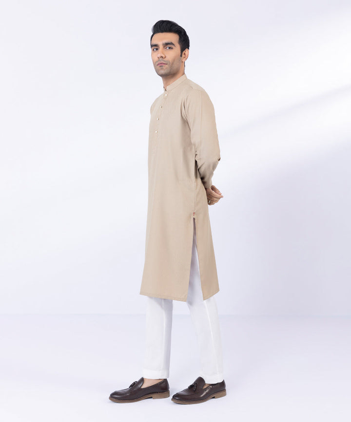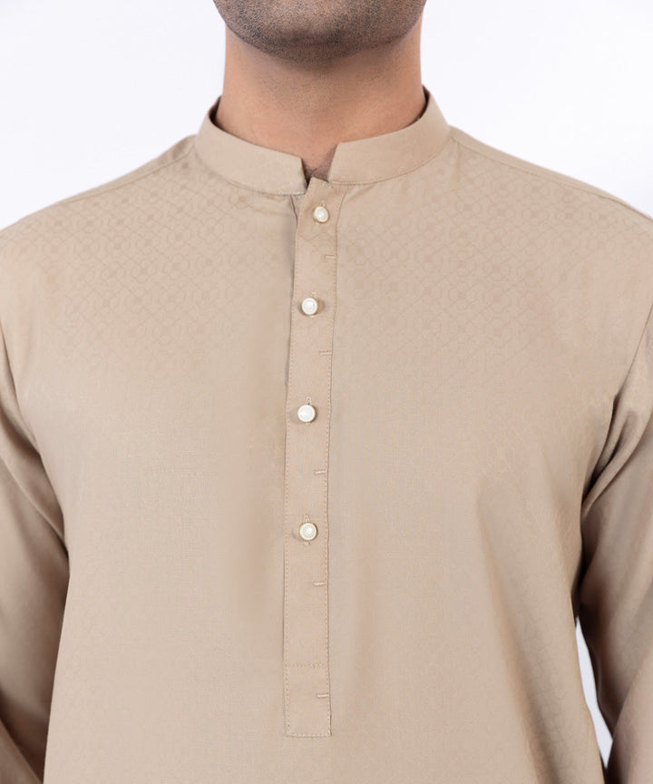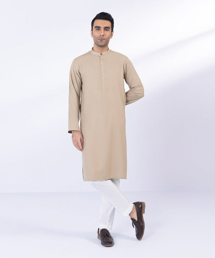 Elevate your style with our khaki textured wash & wear kurta featuring intricate detailing.