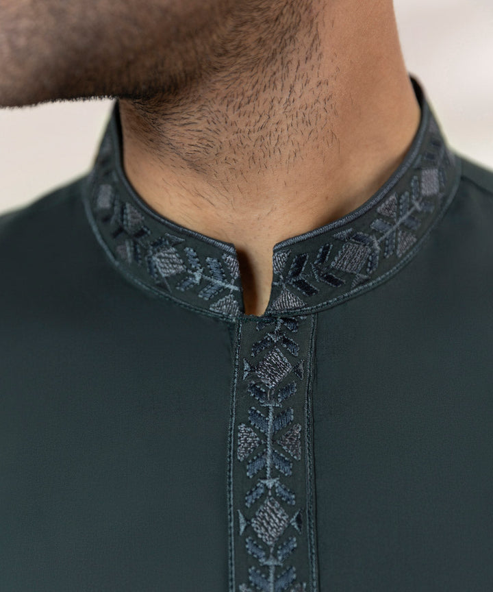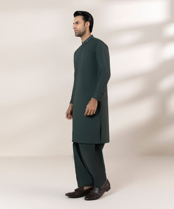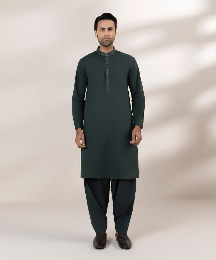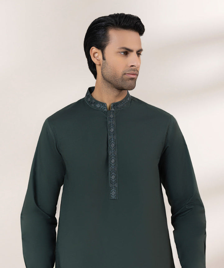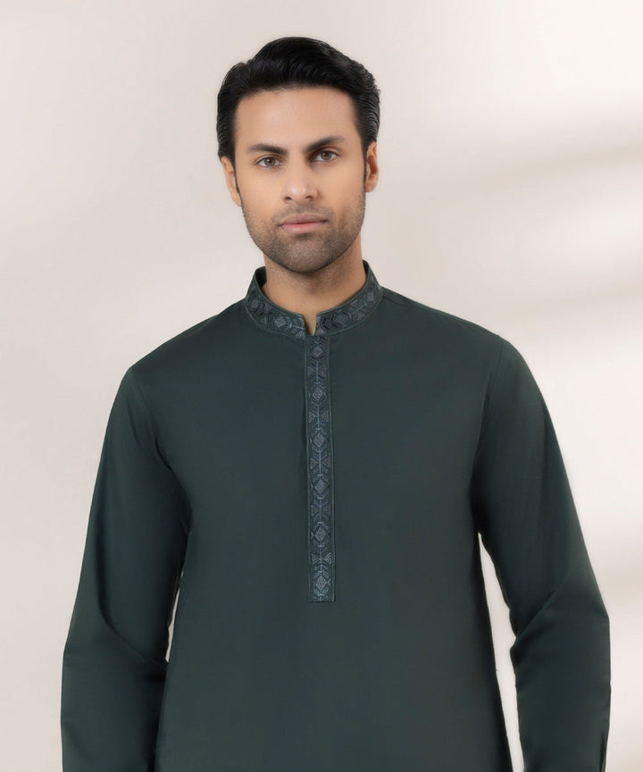 Upgrade your wardrobe with our green fine cotton two-piece suit featuring embroidered kurta.