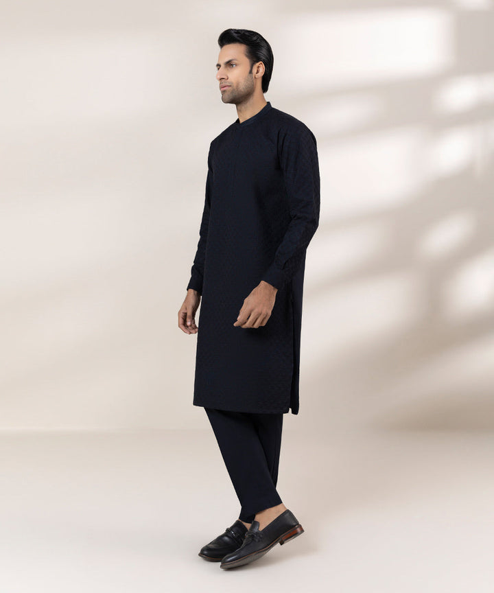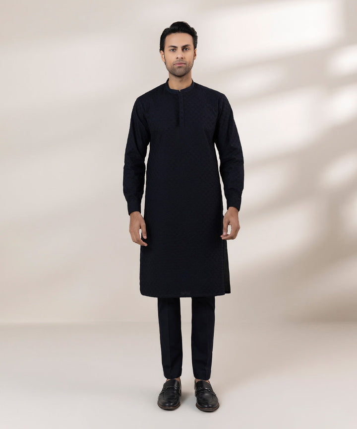 Embroidered Front, Plain Back, Full Sleeves With Cuff, Band Neckline