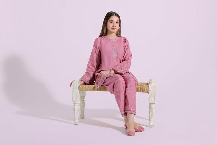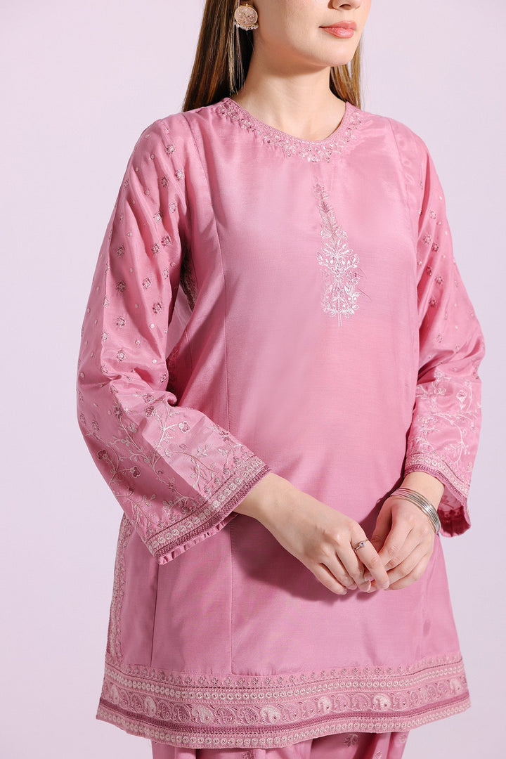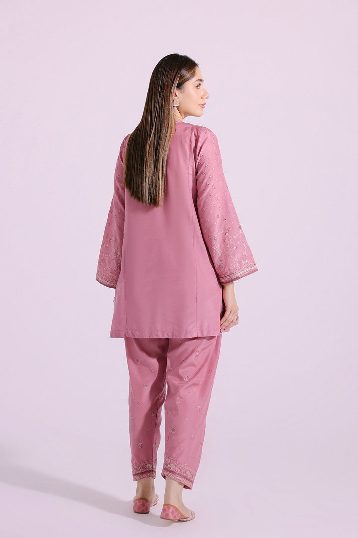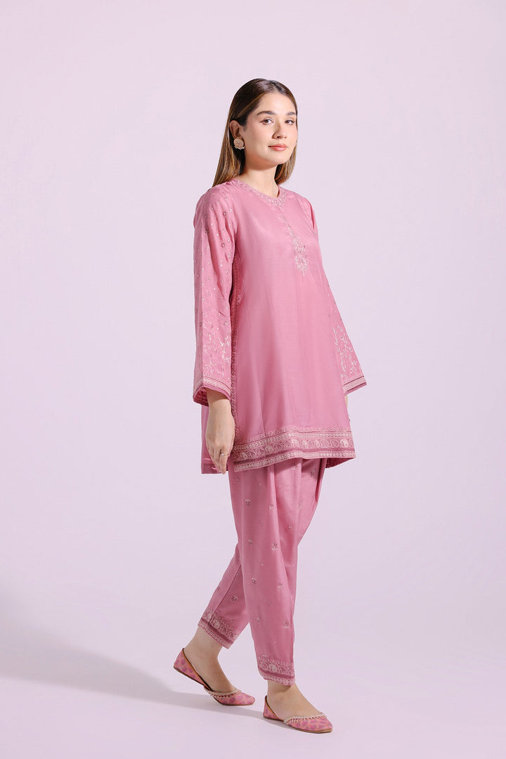 An aesthetically appealing composition is portrayed on this graceful outfit rendered in tea pink shade. It features a classy short silhouette shirt beautifully adorned with intricate embroidery illustrating captivating designs with delicate details. Paired with a traditionally rich shalwar enriched with fascinating embroidery, this gorgeous outfit is a style statement for formal gatherings this season.