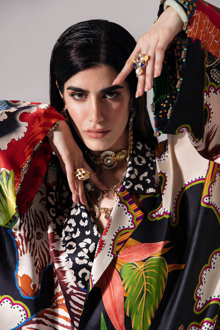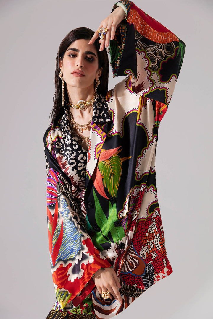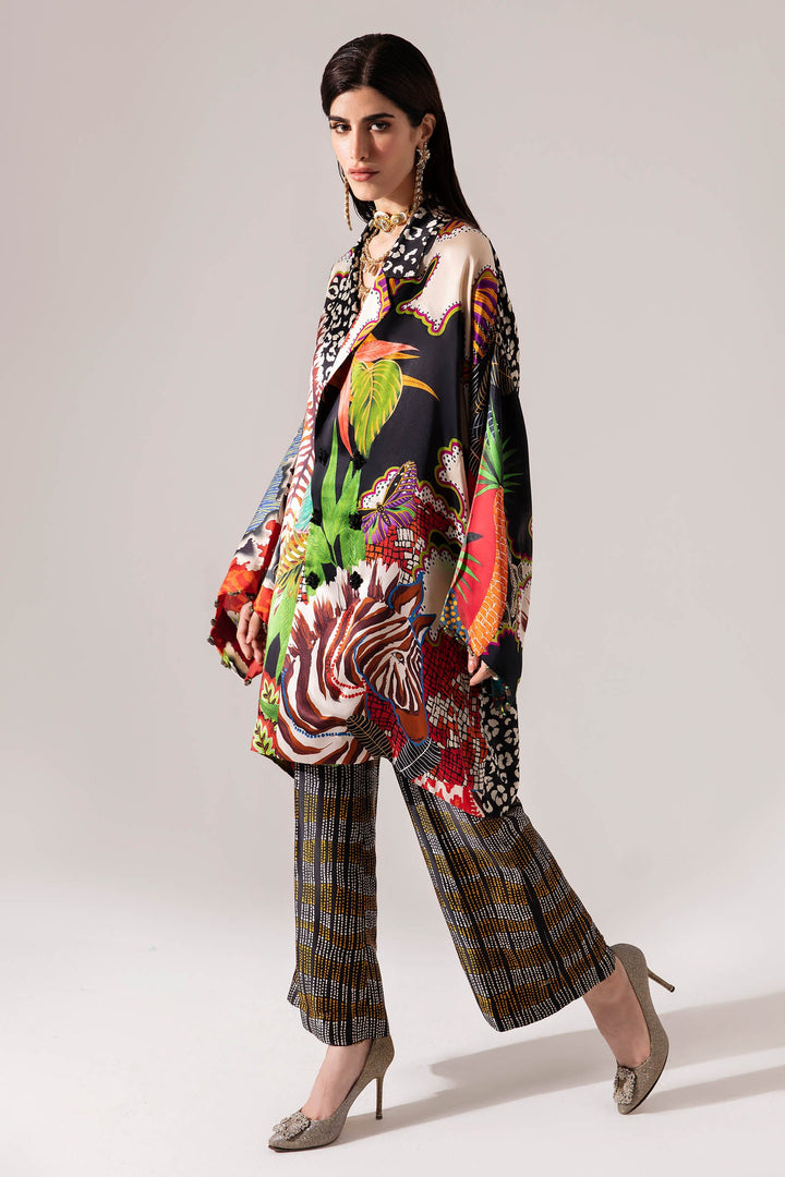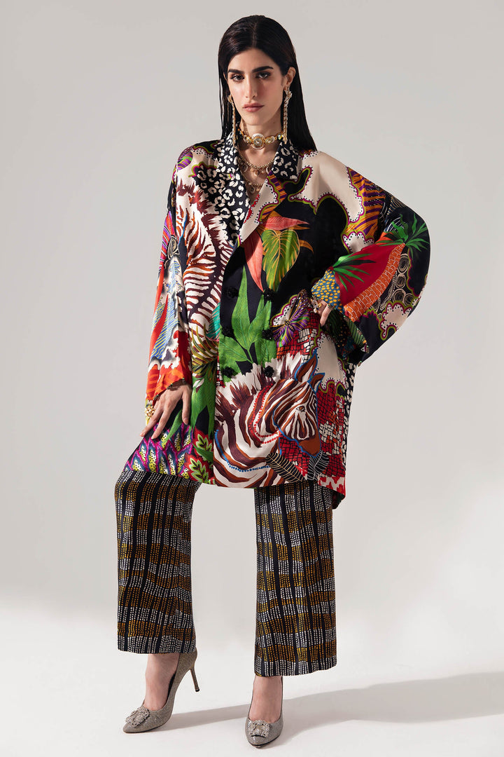 Serva' unfolds like a masterpiece, with obsidian ebony serving as a canvas for psychedelic depictions of African wildlife in all its splendor. A mesmerizing blend of patterns pays homage to the rich tapestry of African art and aesthetics. This limited edition silk ready-to-wear ensemble is a tribute to versatility, sensuality, and audacity. Tailored for the fashion-forward woman, 'Andile' captures the modern ethos perfectly, embracing the essence of individualistic style with every thread and design element.