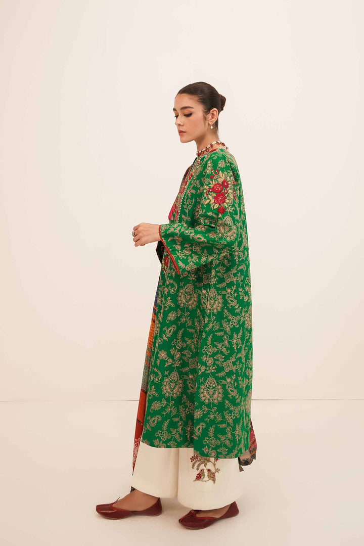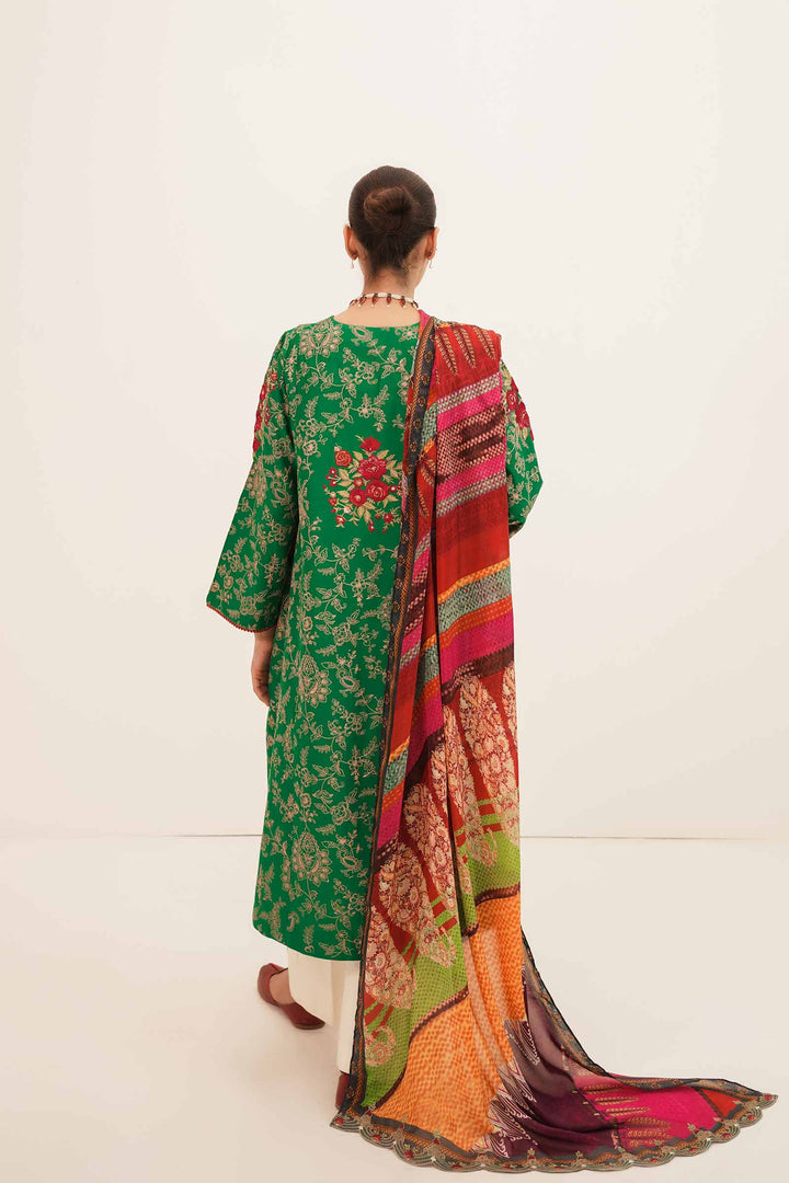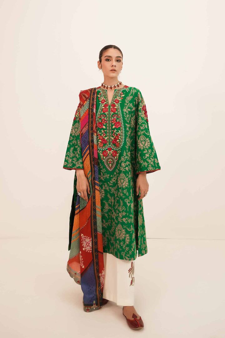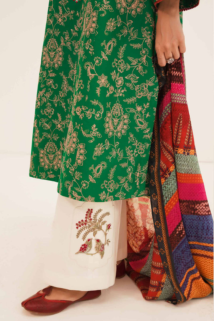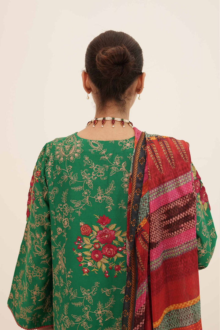 Like a summer story waiting to be told Gulaab A is a forest green lavishly adorned embroidered shirt. Adding little details, the embroidered neckline for the front, the beautifully crafted embroidered borders and the intricate rose motifs add to the festive colors of the attire. Paired with a cream-colored cambric trouser with embroidered motifs, and a royal multi colored silk dupatta, you have yourself one of our favorite Zara Shahjahan classics.