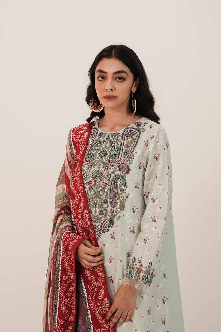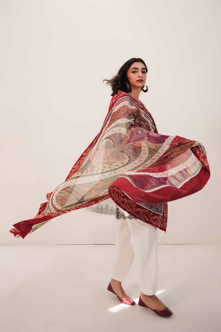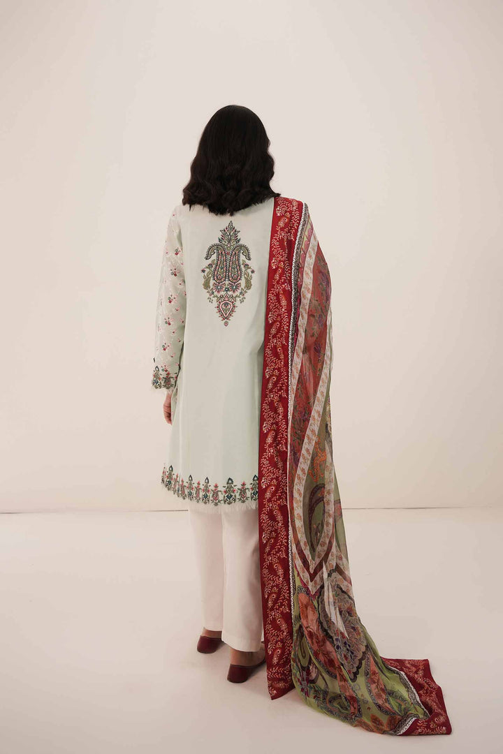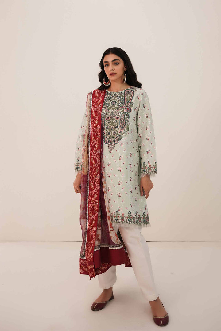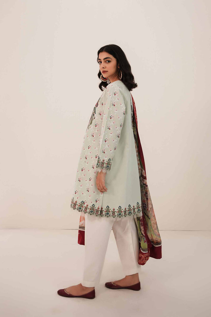 Taking inspiration from the hues of light aqua, teal and maroon, Zeeba B comes with an embroidered shirt with a subtle embroidery all over its front and sleeves. Adding glam to this otherwise unique Zara Shahjahan attire, your intricate embroidered neckline, extensive border patches and a beautiful back motif patch perfectly complement this ensemble. Paired with a royal chiffon dupatta boasting of shades of moss green, and cambric trousers, you are ready for the season.