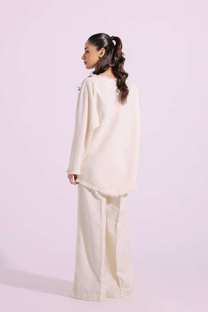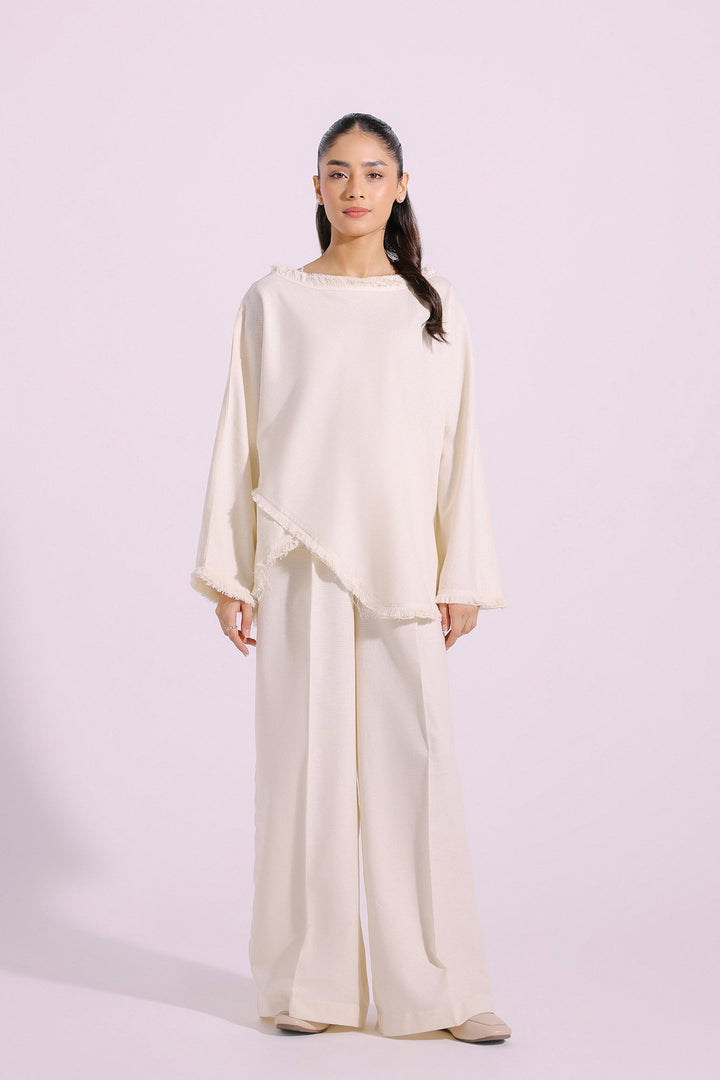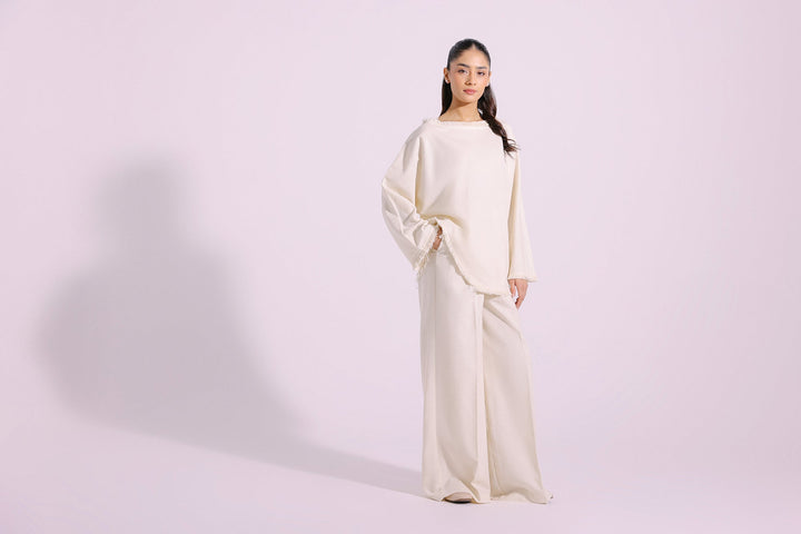 Make a stylish statement in this gorgeous ensemble. This classy outfit comes in a stunning off white hue and features a stunning top with an overlapped hem at bottom and adorned with threaded borders at neck, sleeves and bottom opening. The coordinating flared pants complete this modern look making it a perfect option for happening events.