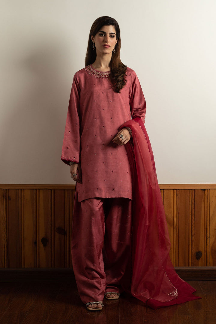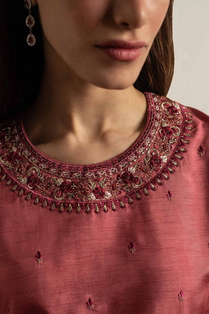 Loose fit embroidered kurta in punch pink with an embellished neckline and pockets. Paired with loose embroidered shalwar and dupatta.