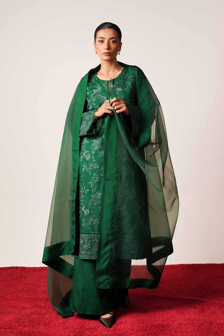 This green kurta has an embroidered front with sleeves in crystal detail and comes with wide-fit trousers and a dupatta.