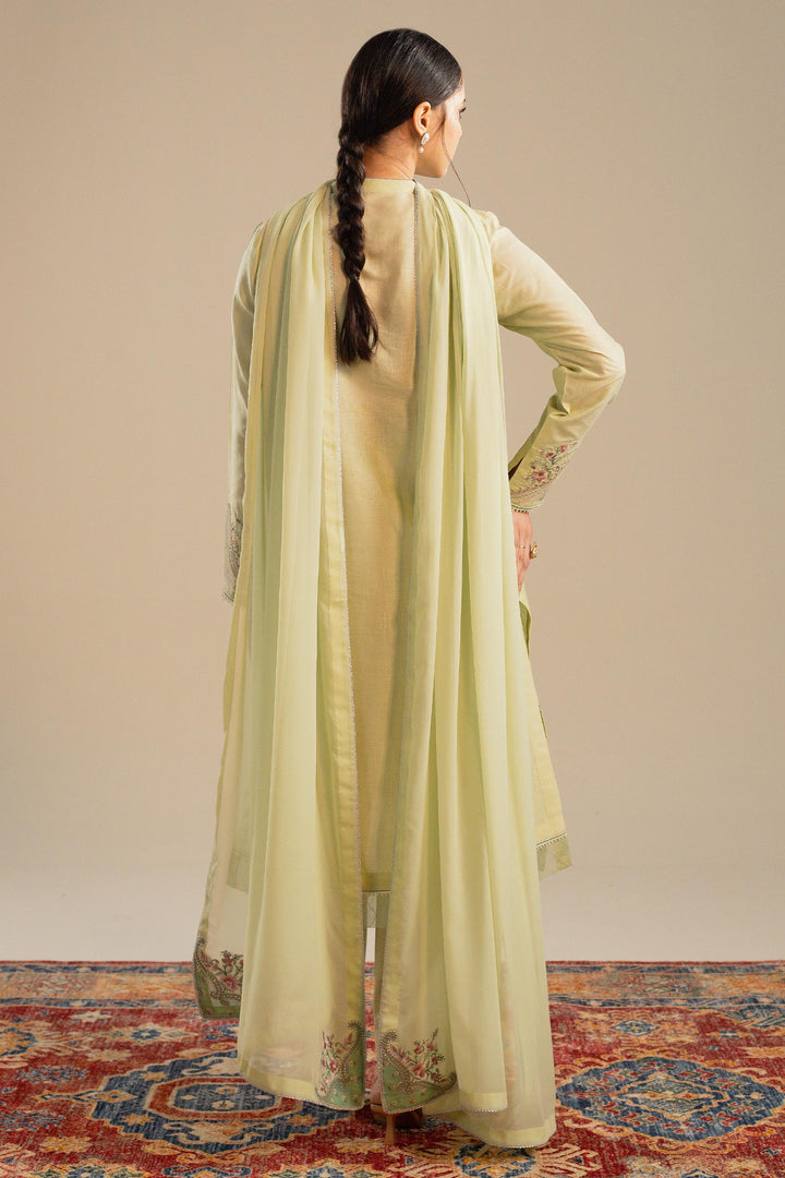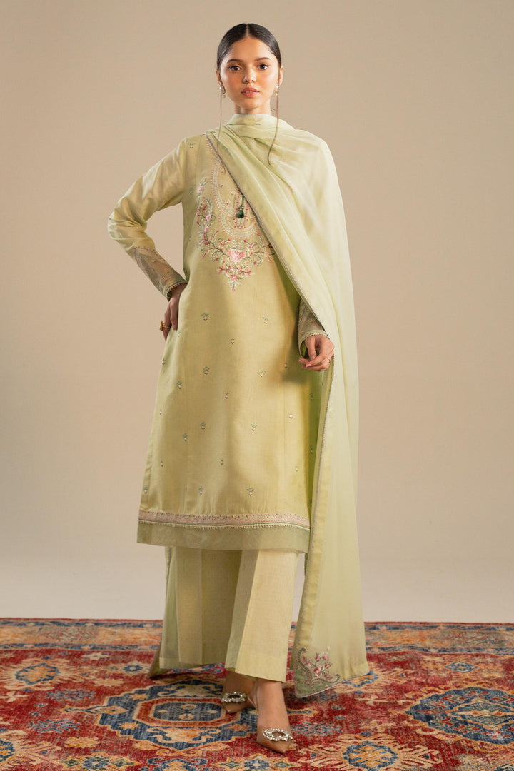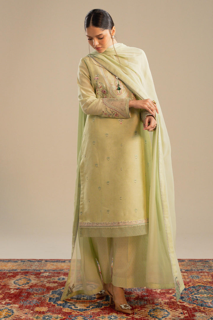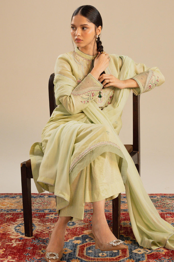 Our elegant pistachio green kurta is rendered with floral and eyelet embroideries in accents of pink and greens. It completes the look with a tonal dupatta and slim-fit pants.