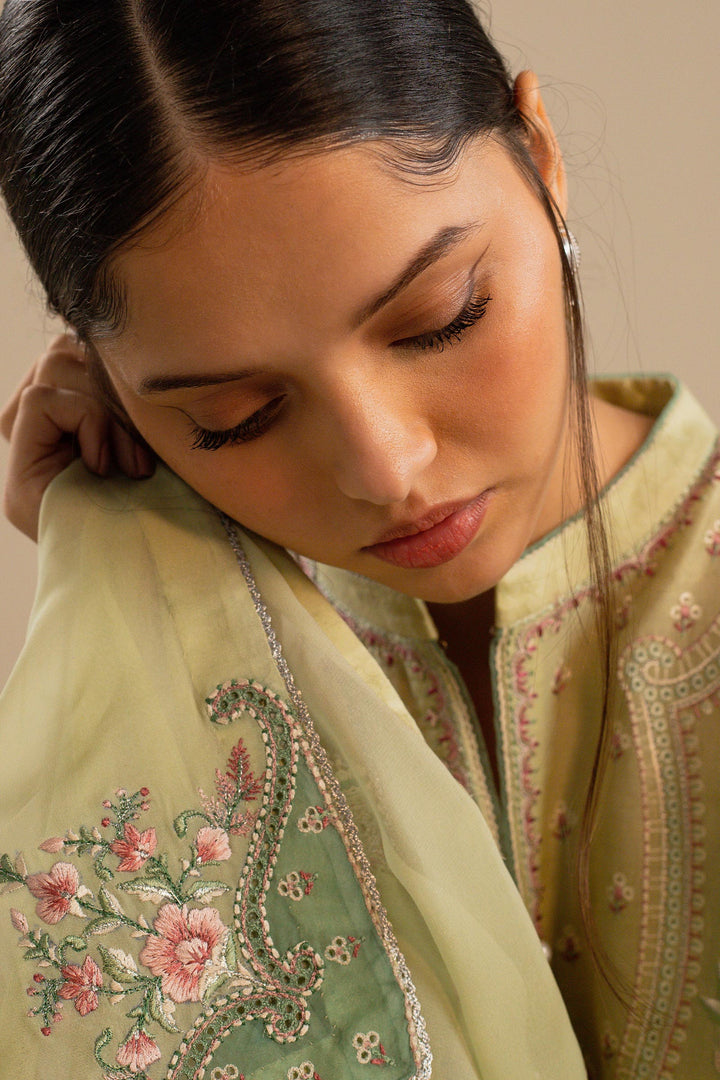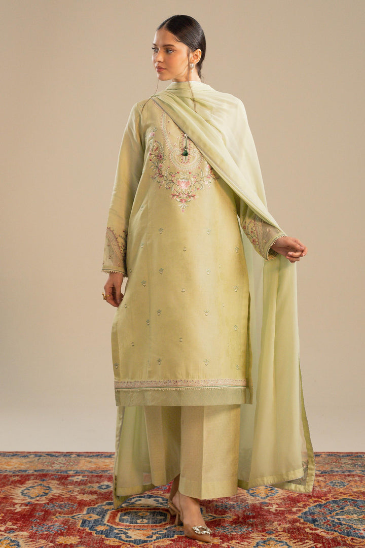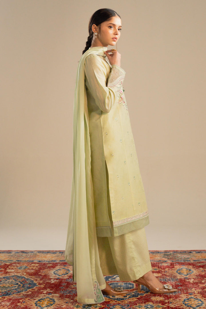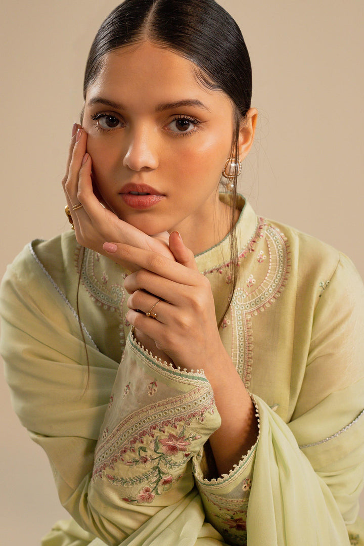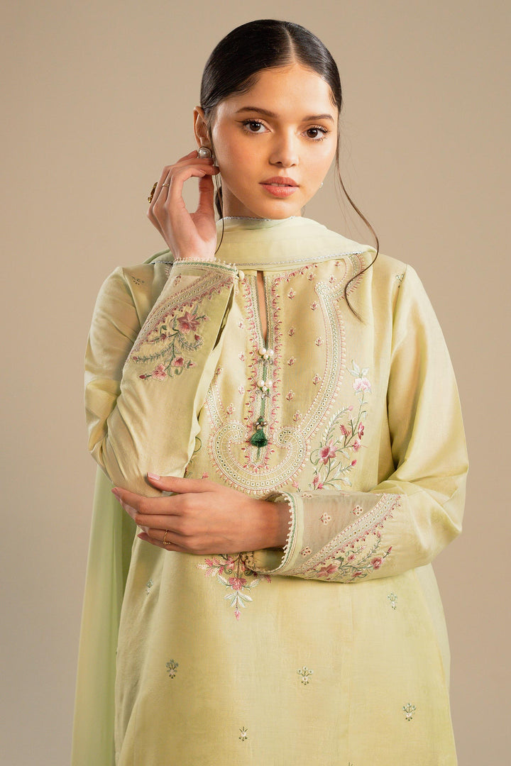 Our elegant pistachio green kurta is rendered with floral and eyelet embroideries in accents of pink and greens. It completes the look with a tonal dupatta and slim-fit pants.