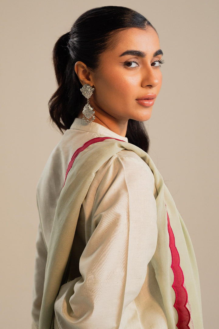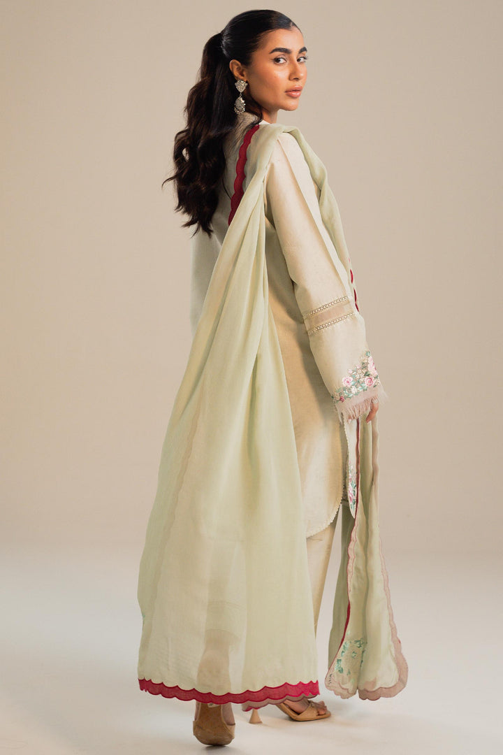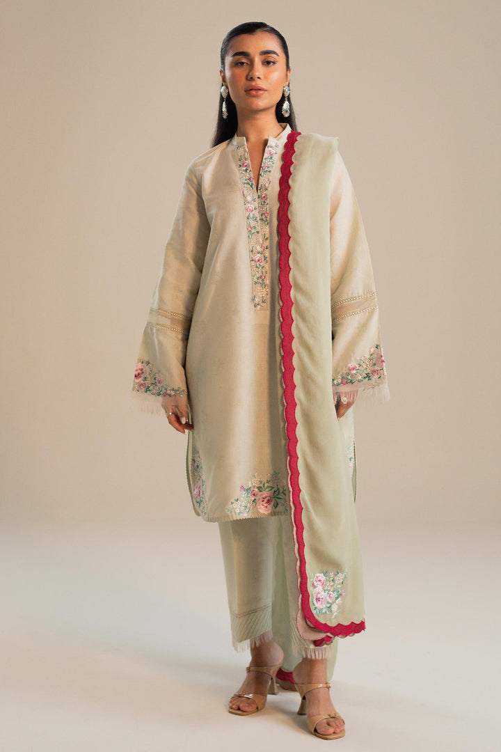 Our silvery sage loose-fit kurta features contemporary rose bunches on the shirt and paired with pin-tuck detail straight-fit pants. A cherry-red accent color is added to enhance the embroidered dupatta.