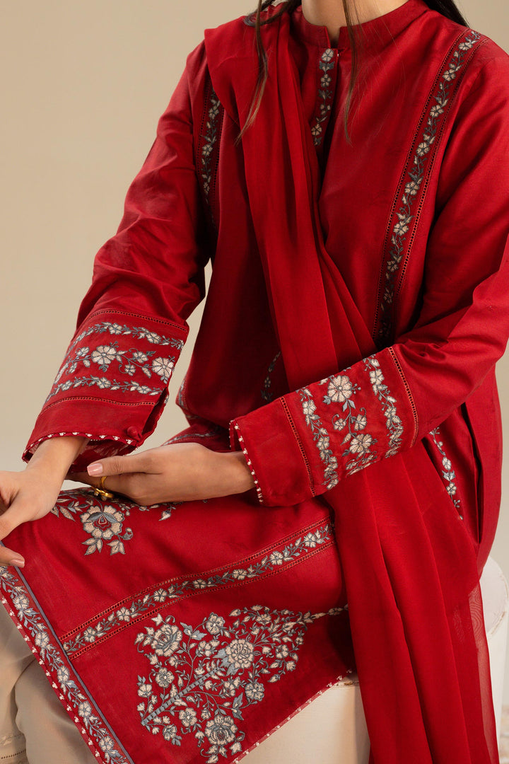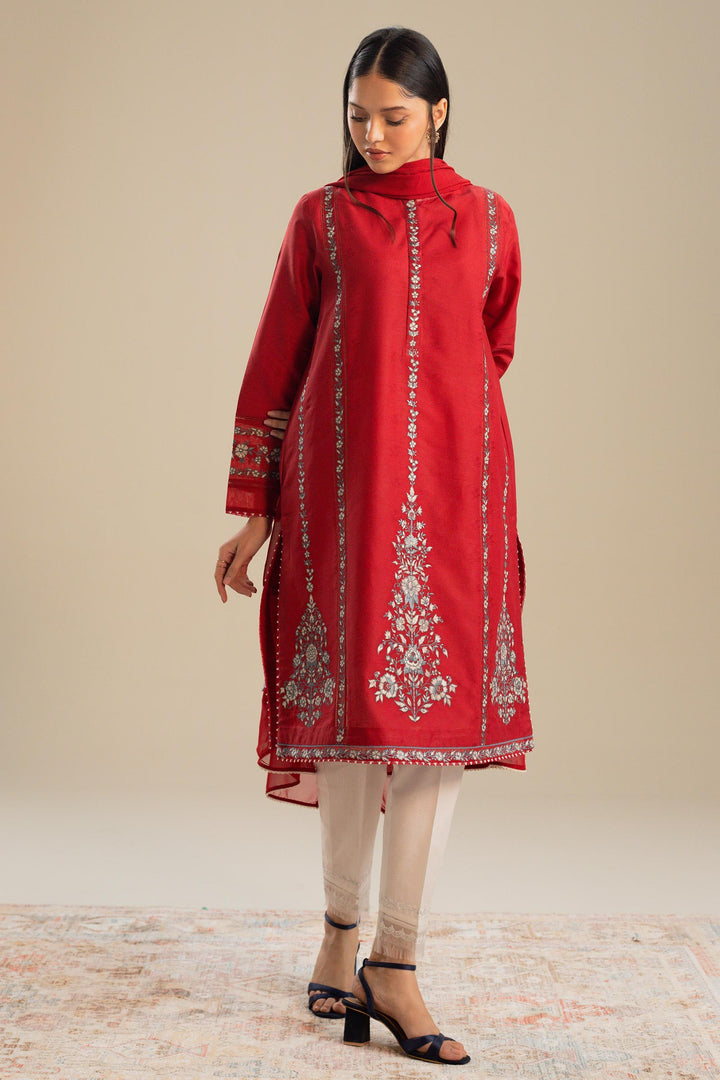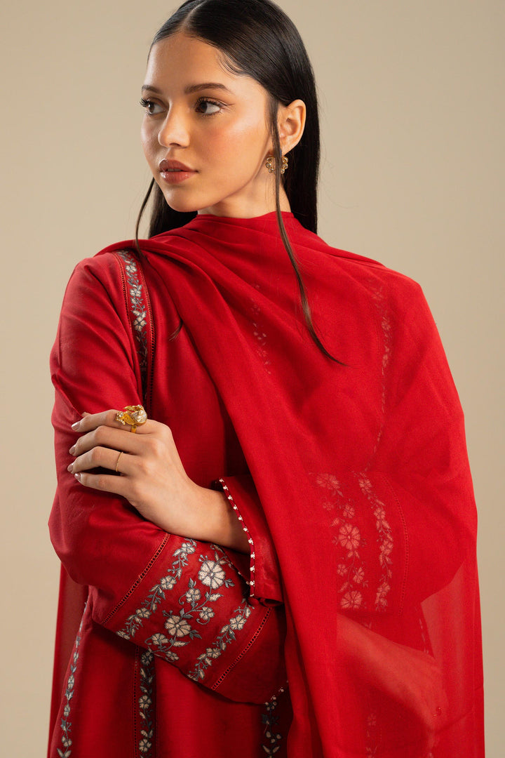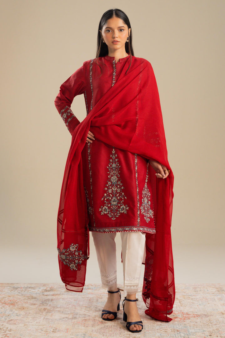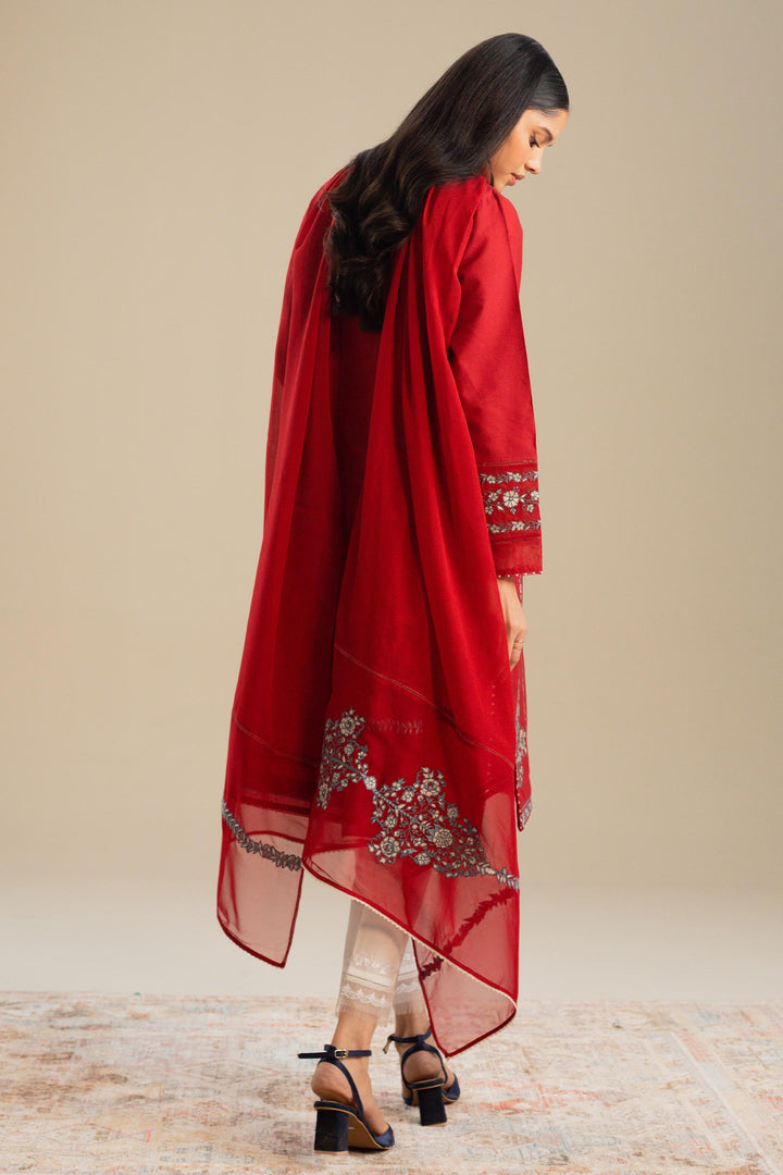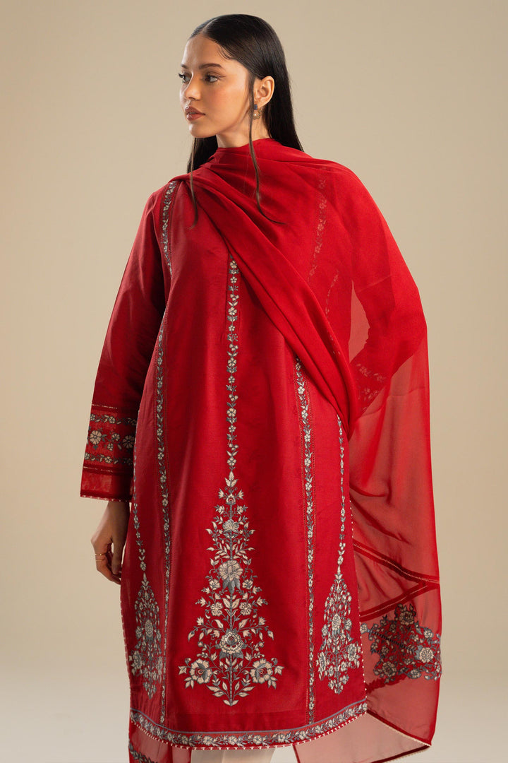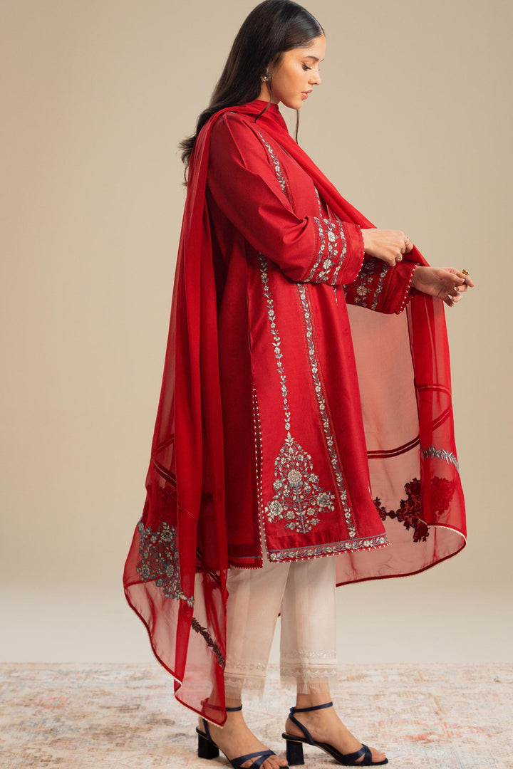 A scarlet paneled kurta features elegantly rendered modern Mughal motifs in accents of ivory and blues, paired with organza-detailed straight-fit pants combined with a tonal embroidered dupatta.