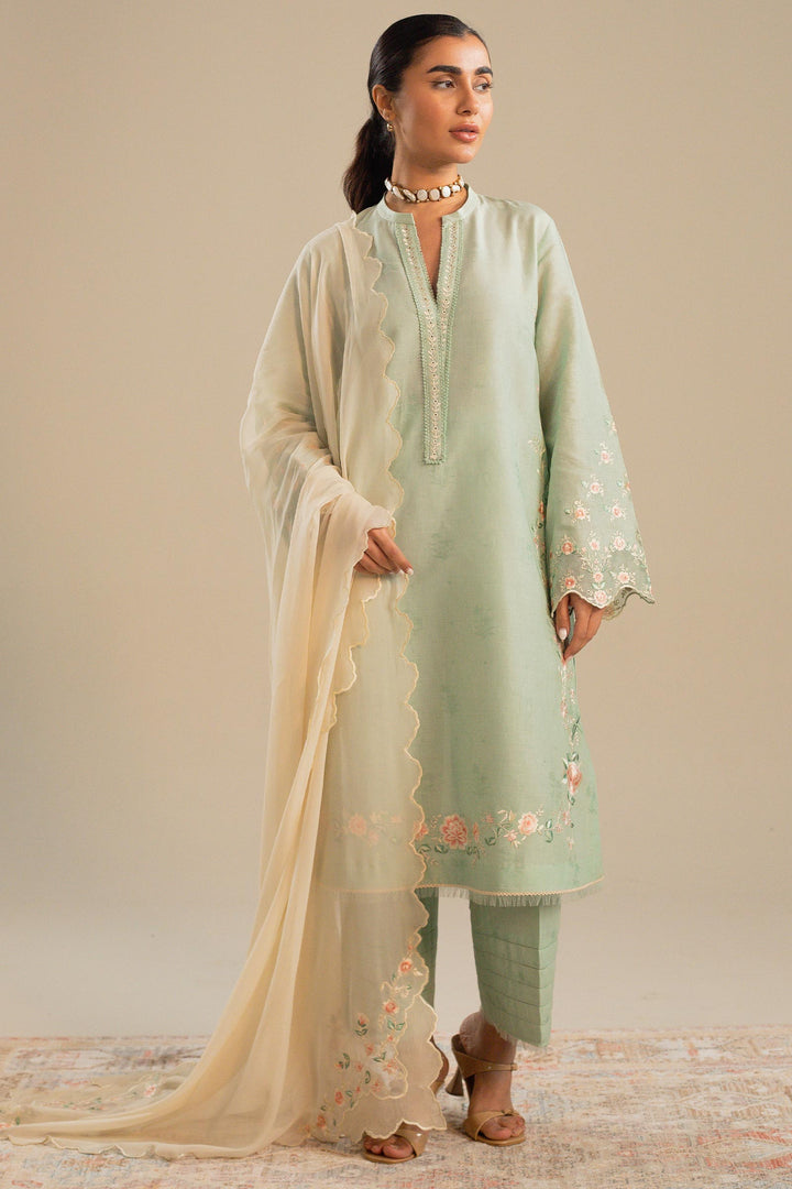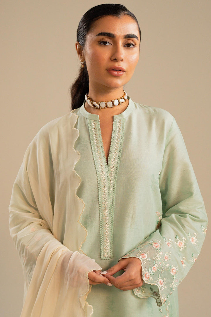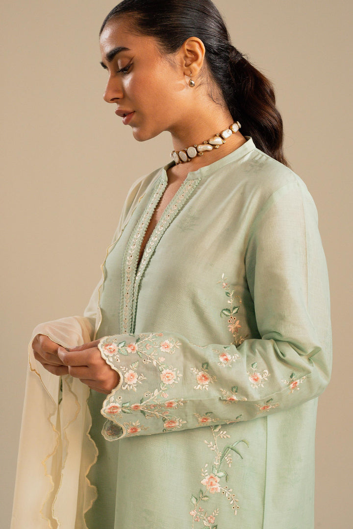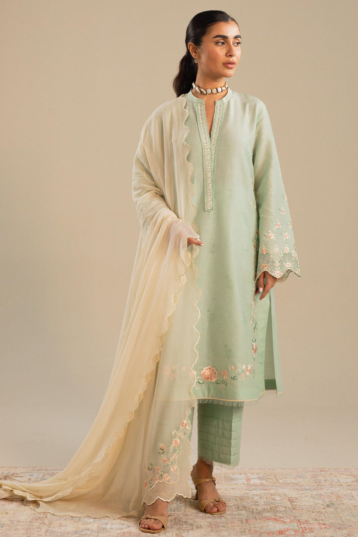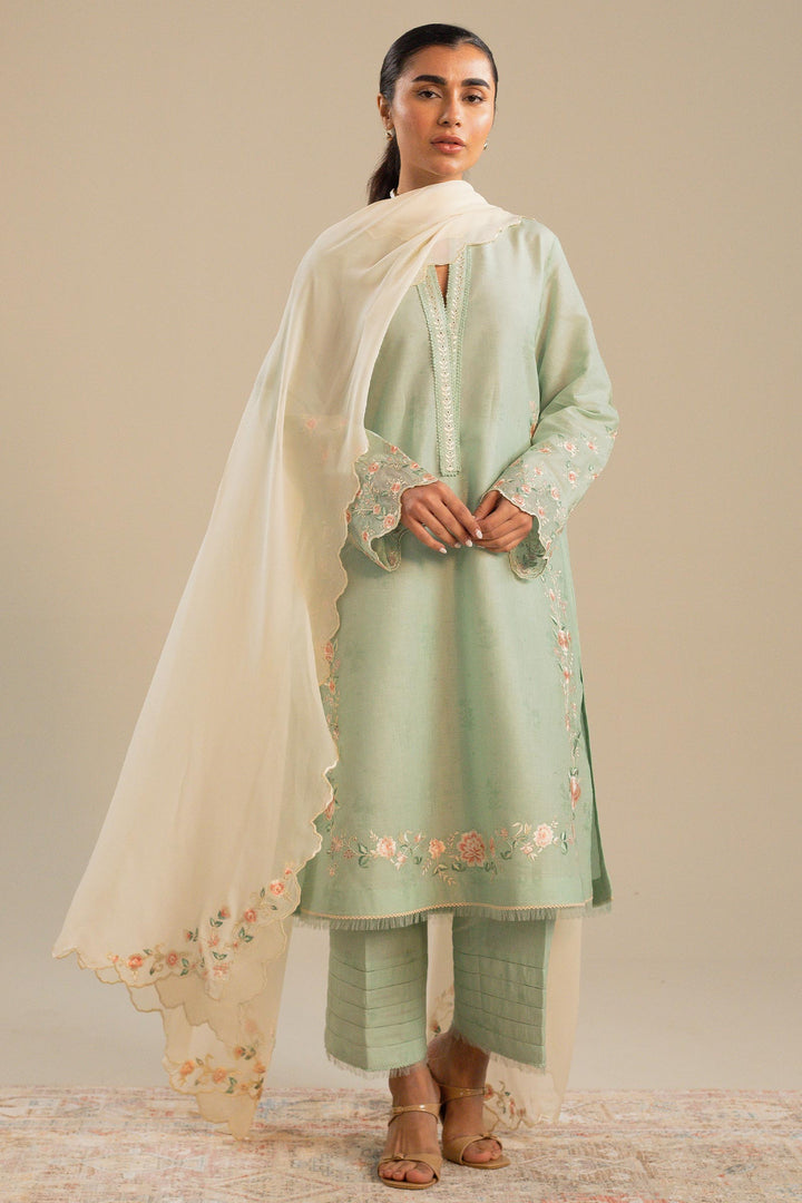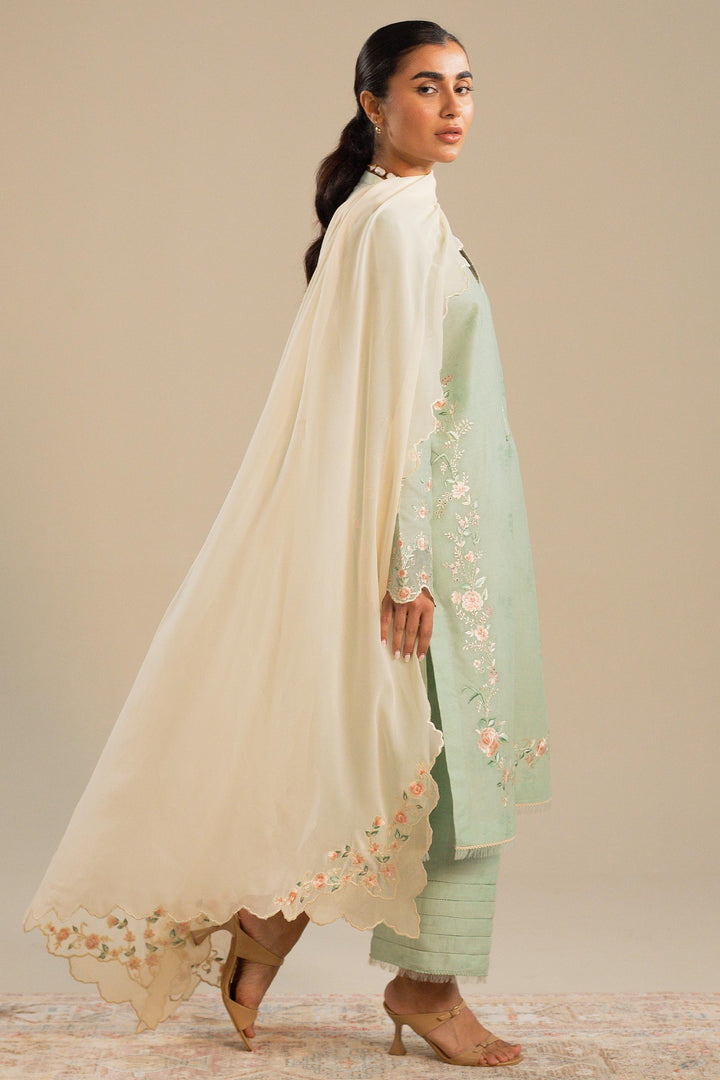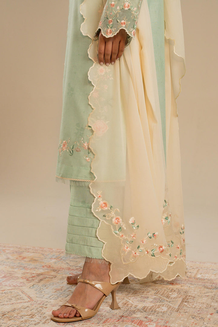 A cool Aqua loose-fit kurta inspired by antique french napkins and florals in hues of peaches and ivory is paired with lace-detailed straight-fit pants and a contrasting ivory embroidered dupatta on the corner.